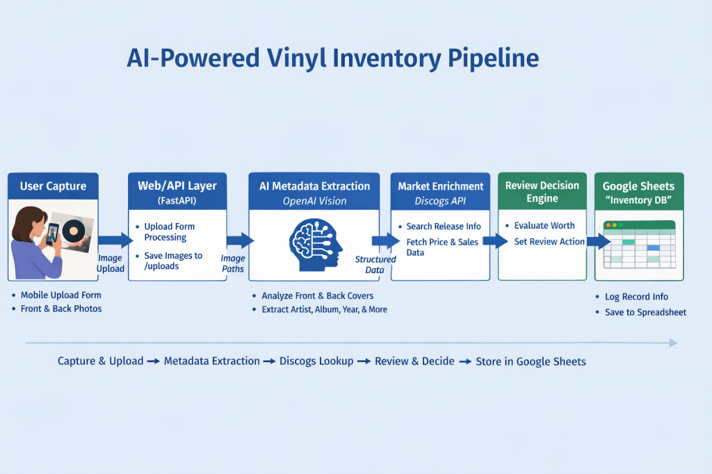 Cataloging this haul created a nice opportunity: build a multimodal cataloging agent that interprets album sleeve images, enriches them with database lookups, estimates value, and logs the result into a shared inventory sheet.